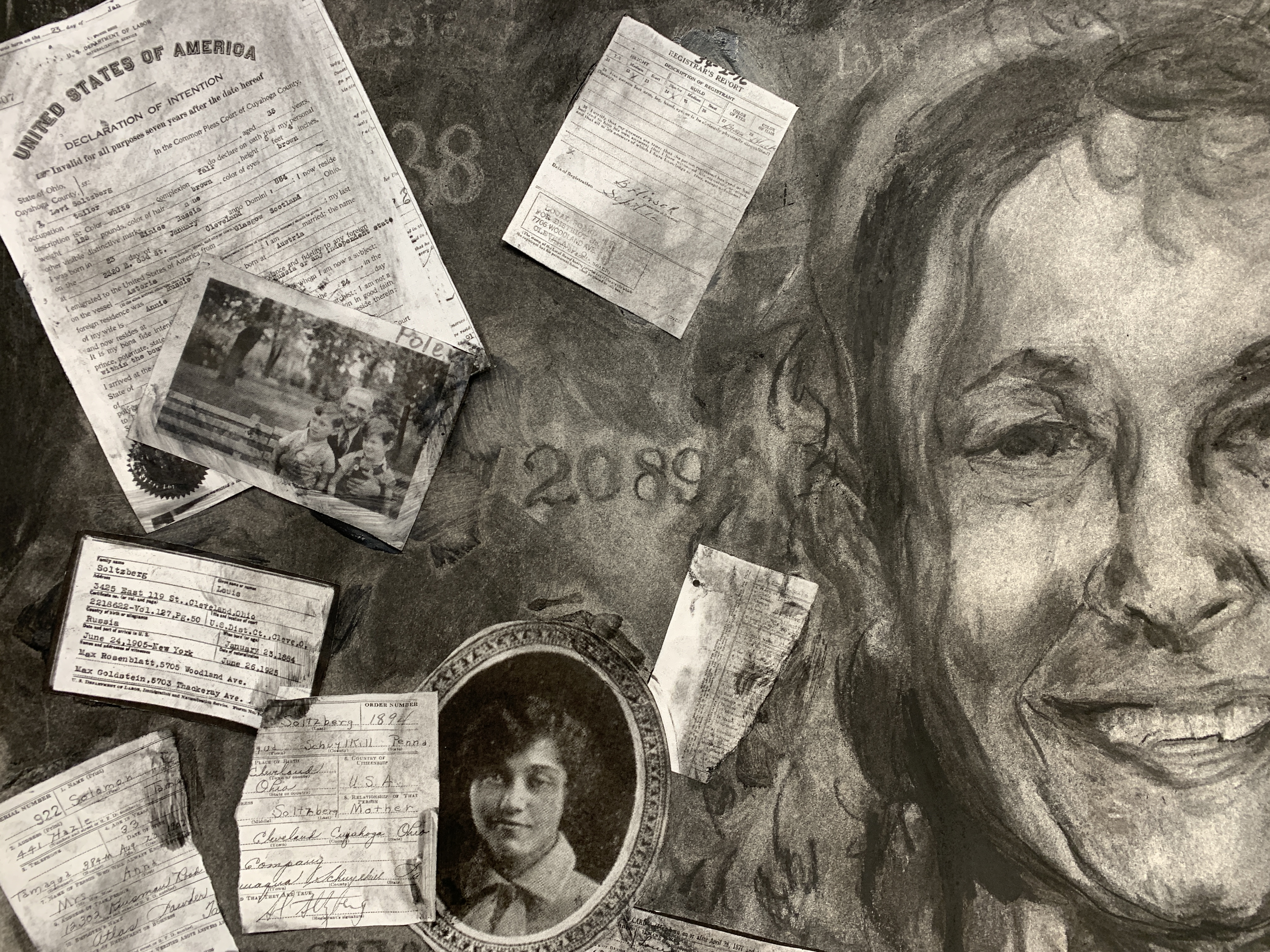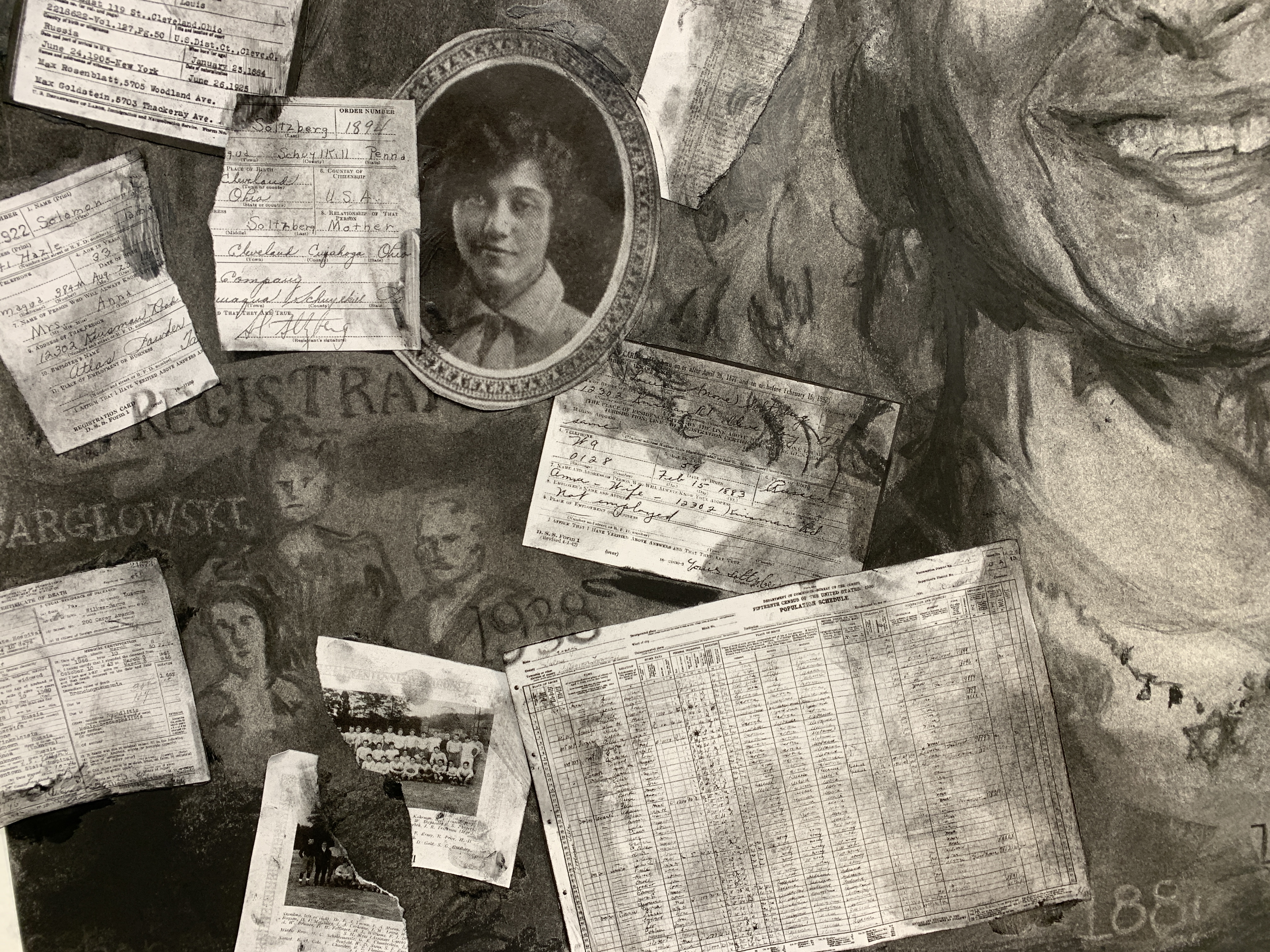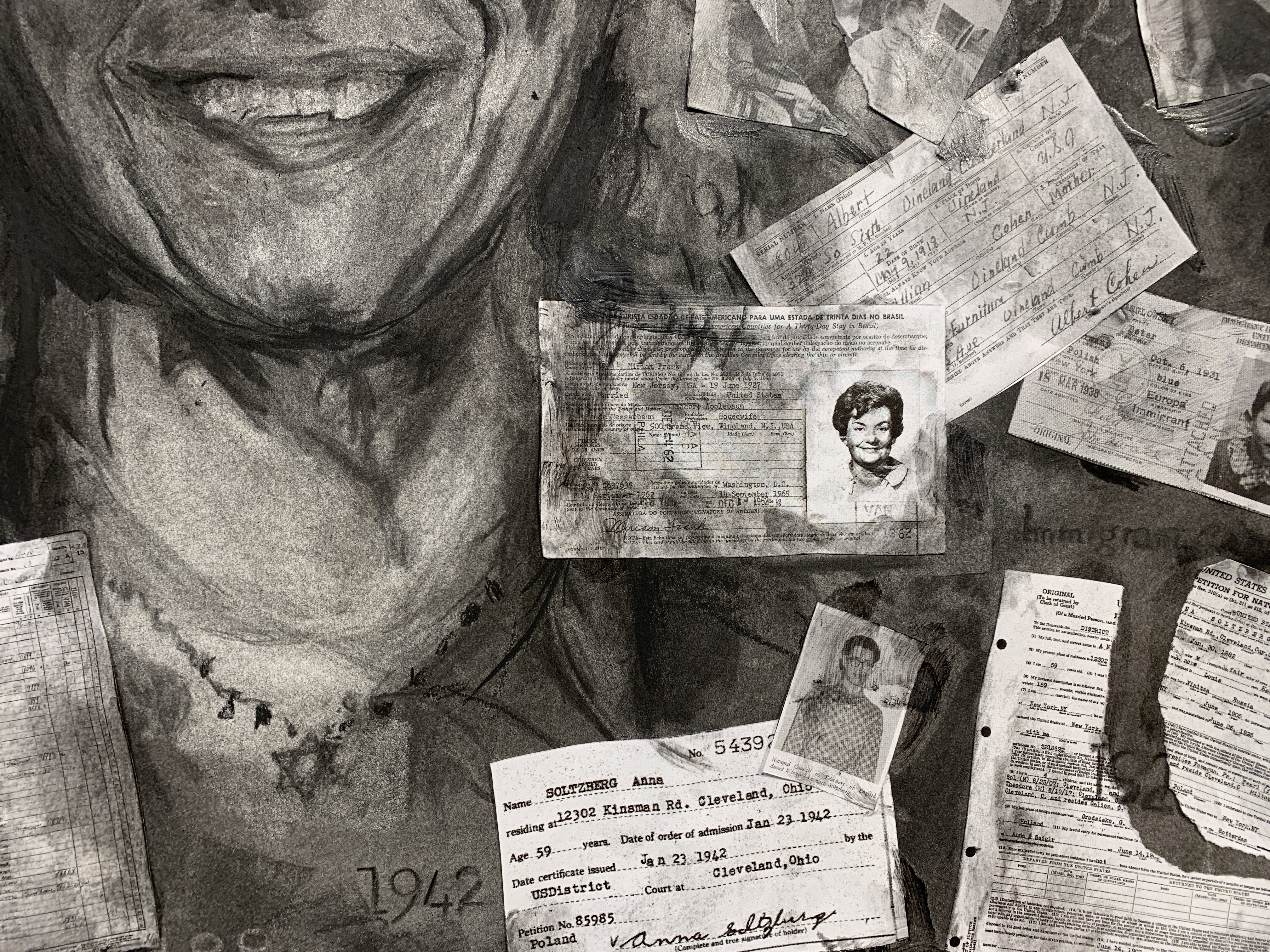 This drawing is an exploration of my ancestry and the characteristics I share with my relatives. I used Adobe Photoshop to combine images of myself, my brother, my parents, and my grandparents. I then drew the charcoal portrait using the compiled image as a reference. I layered printed out images of family immigration documents, draft cards, school pictures, and other memorabilia on top.