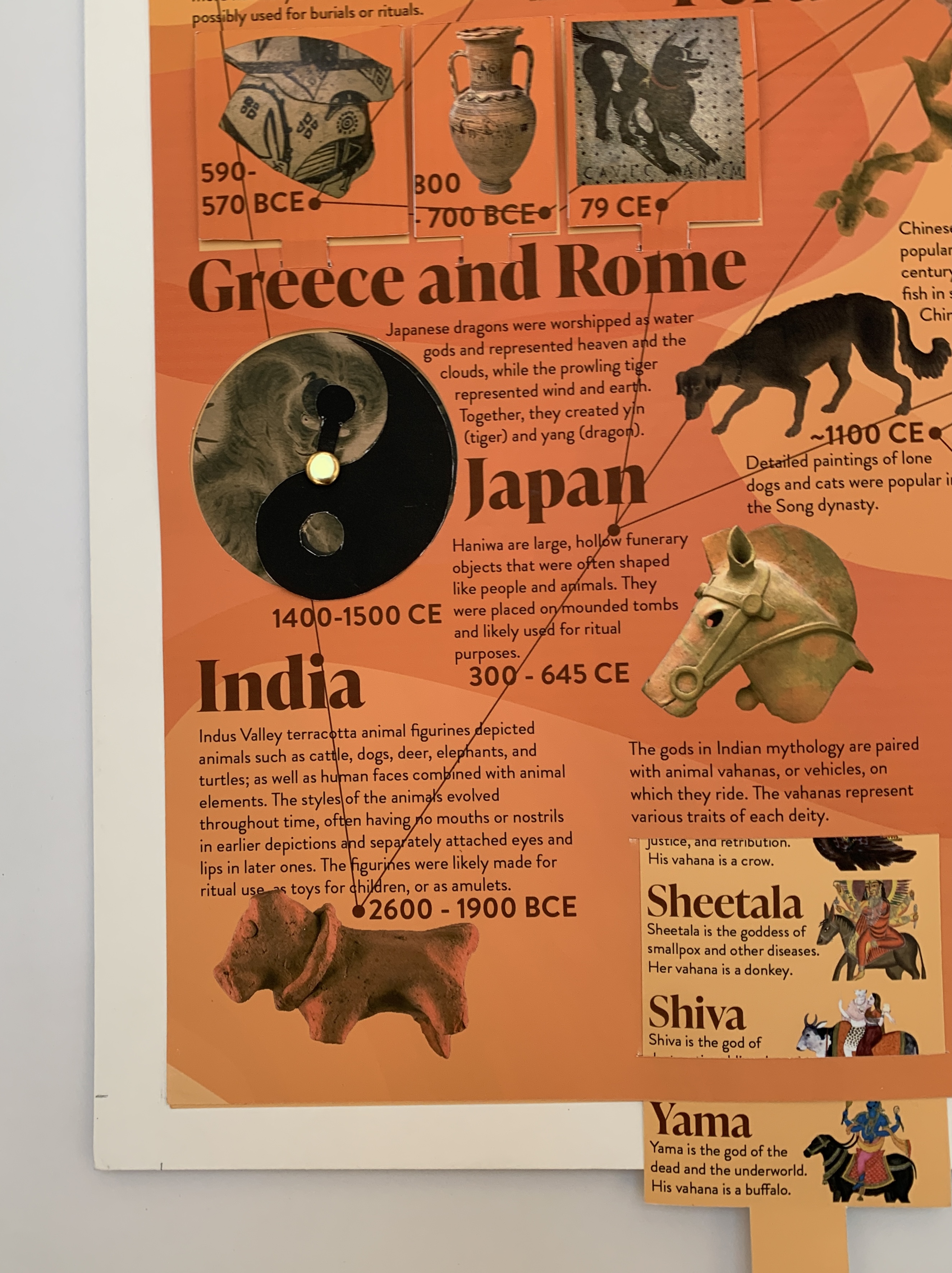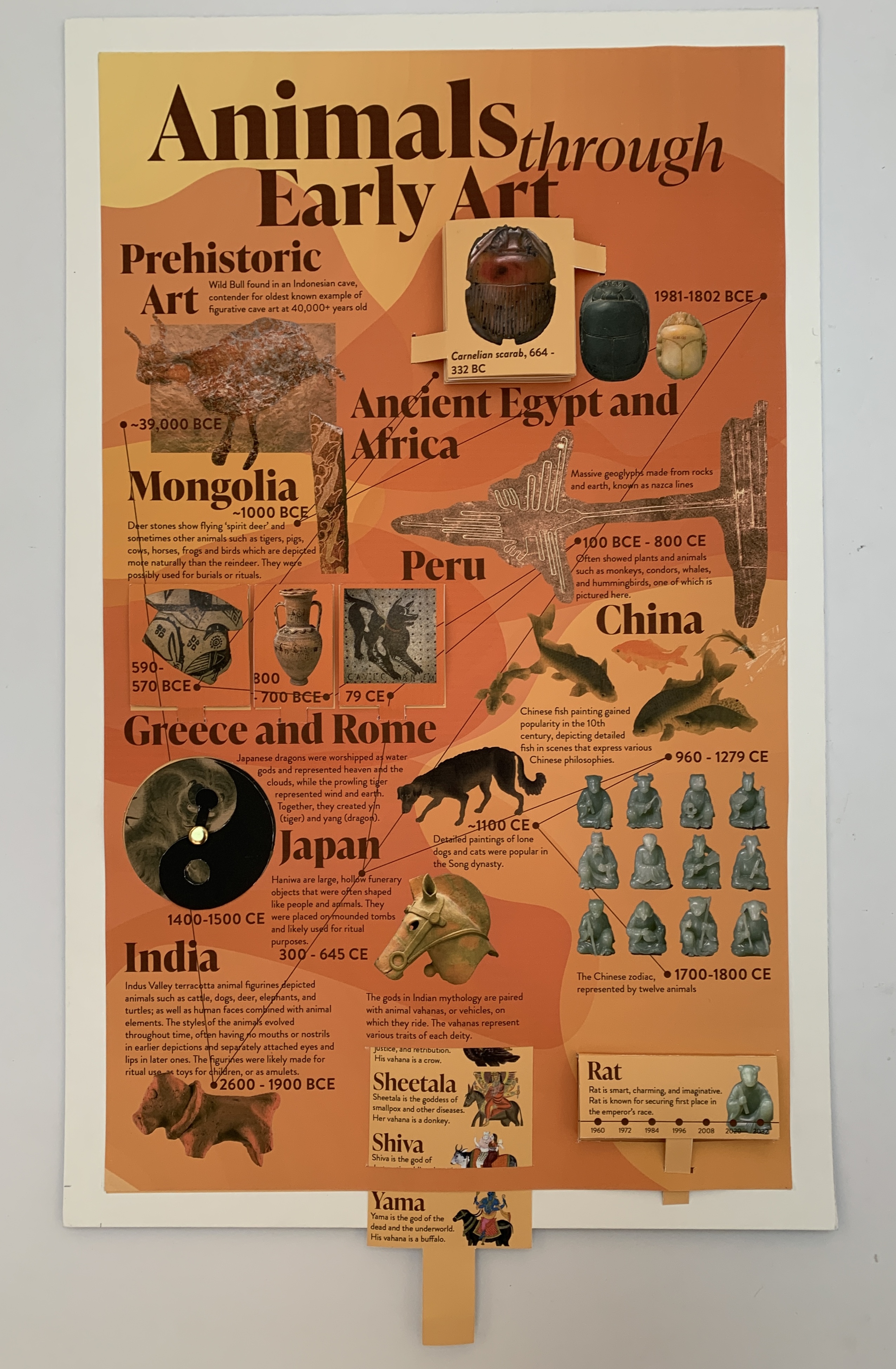 This project was made for an open-ended final assignment for Art History, through which we had to explore a theme that we had noticed in our studies throughout the class. My interpretation of the assignment aims to explore the depiction of animals through early art history. It focuses on prehistory: Egypt; Africa; Mongolia; Peru; China; Greece; Rome; Japan; and India. The depiction of animals in each culture teaches us about many aspects of their society, including religion, class, and economy. Through the analysis of the symbolization of animals in each culture and the way animals were used in art, viewers can draw connections and comparisons between the many different cultures. The interactive elements provide more information about certain art styles or religious usages in some cultures, and invite interaction and curiosity in the viewer.